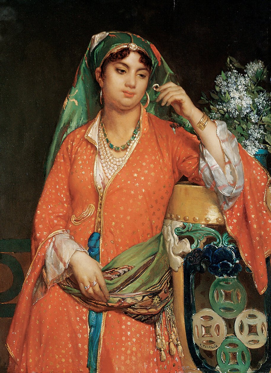 materialismus · weiblich · jung · orientalisch · begehren · orientalistisch · luxus · blumen · reichtum · schmuck · exotisch · reichtum · seide · porträt · schatz · frau · bewundernd · glänzend · opulent · reich · schönheit · kopfschmuck · ring · textilien · juwelen · gold · Dreiviertel-Länge · Private Collection / Bridgeman Images |