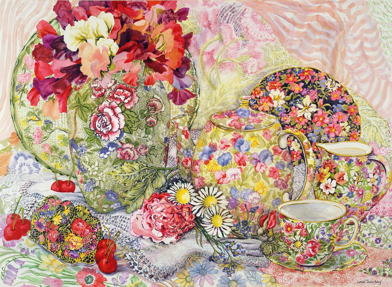 Duftwicken mit antikem Blumenporzellan und Kirschen(Sweet Peas with Flowered Antique China and Cherries )Joan Thewsey |