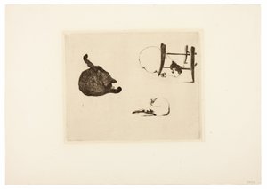 Die zwei Katzen. Illustration zu Kaalunds "Fabler for Børn"(De to katte. F.o. studier af kattehoveder, en fugl, et katteøre og bjælke-værk. Illustration til Kaalunds "Fabler for Børn". Se kommentar fra arkkatalog.)Johan Thomas Lundbye |