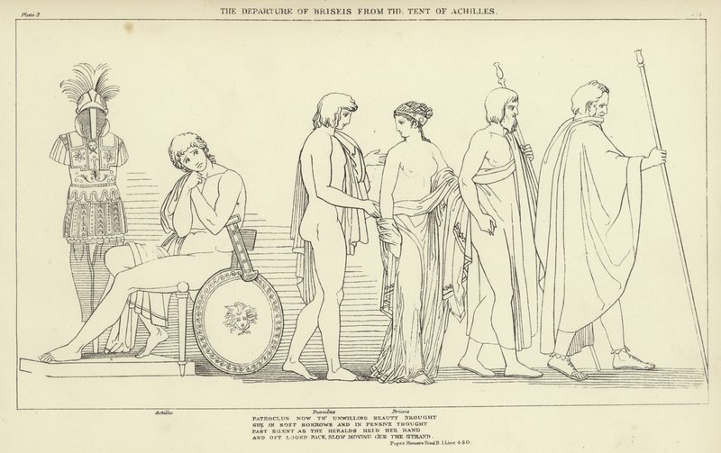 Agamemnon beauftragte die Herolde Taltibius und Euribat mit der Entführung von Briseis; Achilles ließ sie von Patroklos übergeben. Zeichnung von John Flaxman (1755 - 1826). Homers Ilias. Gesang I Die Gesandtschaft zu Achilles Penelope trägt den Bogen des Odysseus zu den Freiern Vulkan und Chares empfangen Thetis Minerva unterdrückt die Wut des Achilles Vulkan und Charis treffen Thetis Venus verkleidet lädt Helena in das Gemach von Paris ein Westminster School - Szene aus Der Andria von Terenz Odysseus verlässt Lakedaemon nach Ithaka Hector tadelt Paris Der glückliche Mann Bescheidenheit und Gerechtigkeit kehren in den Himmel zurück Orestes Merkurs Botschaft an Kalypso Pandora wird zu Epimetheus gebracht Venus Vulkan und Thetis Das Urteil des Paris Das Treffen von Hector und Andromache Antikes griechisches Frauenkostüm Die Furien Die Schauspieler unterrichten Odysseus folgt dem Wagen von Nausikaa Andromache ohnmächtig an der Mauer Antikes griechisches Frauenkostüm Kassandra wird für ihre Hochzeit mit Bellerophon vorbereitet Pandora bekleidet Pilatus wäscht seine Hände Astraeus und Aurora