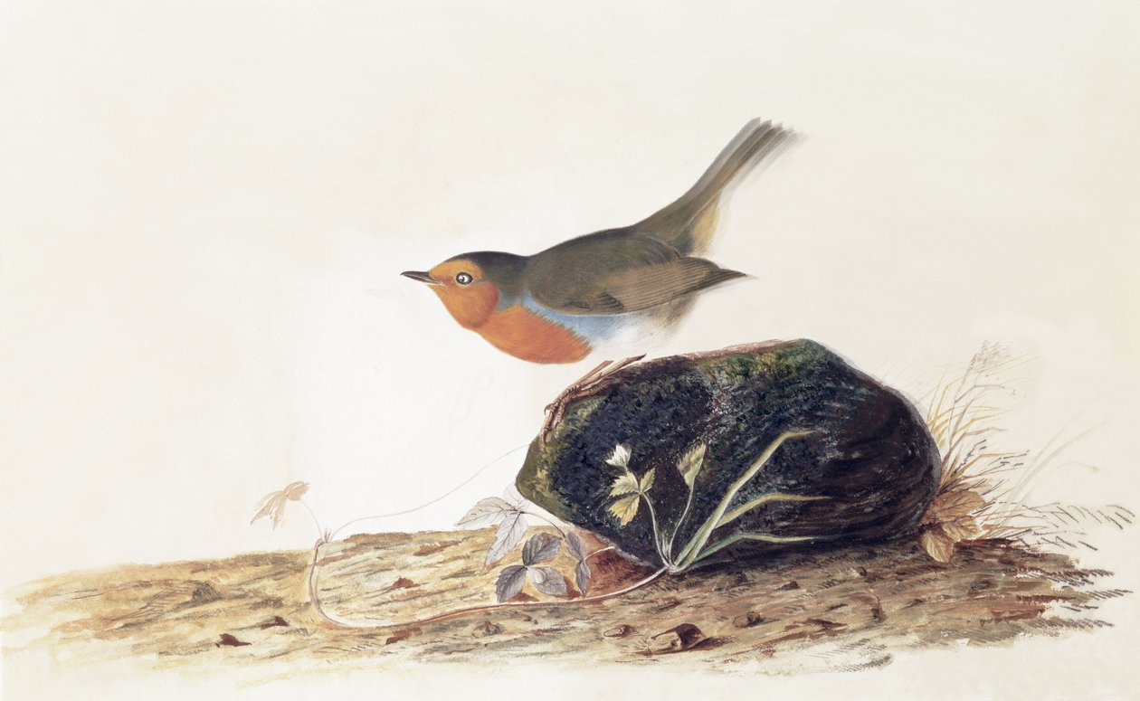 Ein Rotkehlchen auf einem moosigen Stein(A Robin Perched on a Mossy Stone)John James Audubon |