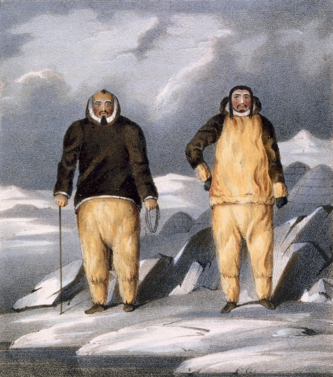 illustration · illustrationen · erzählung · sekunde · reise · nordwestpassage · arktis · polar · erforschung · entdeckung · kapitän · john ross · james clark ross · brandard · inuit · eskimo · eskimos · eingeborener · eingeborener · iglu · iglus · ethnographie · ethnographie · koniaroklik · neweetioke · tracht · tracht · kleidung · kleidung · doppel · zwei · Paar · Porträt · Private Collection / Bridgeman Images |