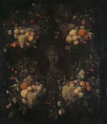 Simuliertes skulptiertes Frauenkopf in einer Kartusche mit Fruchtschwüngen dekoriert(Simulated Sculpted Head of a Woman in a Cartouche Decorated with Swags of Fruit)Joris van Son(painter),Jan Frans van Son (rejected attribution)(painter) |