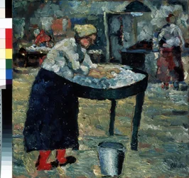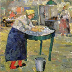 Eine Wäscherin(Une blanchisseuse (A Laundress). Dans une cour, une femme courbee sur un bac sureleve, occupee a laver du linge, a ses pieds un seau en metal. A l'arriere plan, d'autres femmes faisant des activites complementaires, chauffage de l'eau, repassage. Impressio)Kazimir Severinovich Malevich |