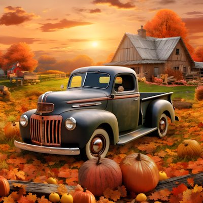 Dieses Bild wurde mit Hilfe von generativer KI erstellt. 2023 · Digital Art - Computermade 3d - midjourney - Photoshop · Bild ID: 1475790 der Truck ist mit Kürbissen gefüllt, eine Scheune und sanfte Hügel im Hintergrund, Herbst-Thema mit Herbstfarben und Kürbissen in verschiedenen Farben