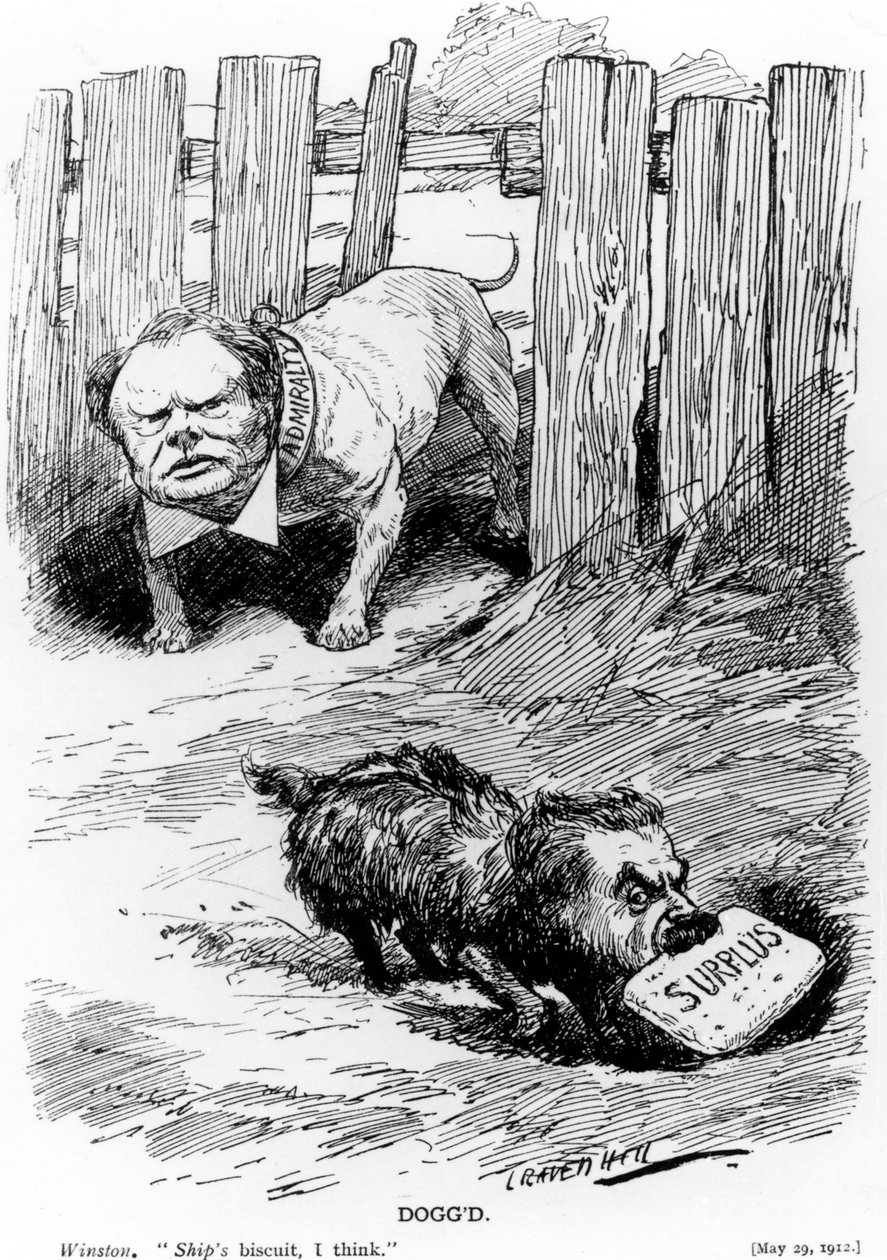 karikatur · karikatur · humor · schlagen · edwardian · 1910er jahre · politik · politisch · satire · satirisch · hund · hunde · graben · begraben · Überschuss · wirtschaft · wirtschaftlich · sich verstecken · gier · gierig · politiker · politiker · winston · schiffskeks · craven hill · admiralität · Private Collection / Bridgeman Images |