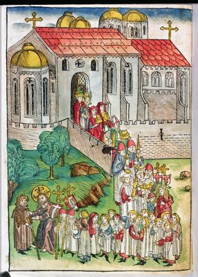 Pilger von Santiago de Compostela und Prozession, 1491(Pilgrim of Santiago de Compostela and procession, 1491 (colour woodcut))Michael Wolgemut |