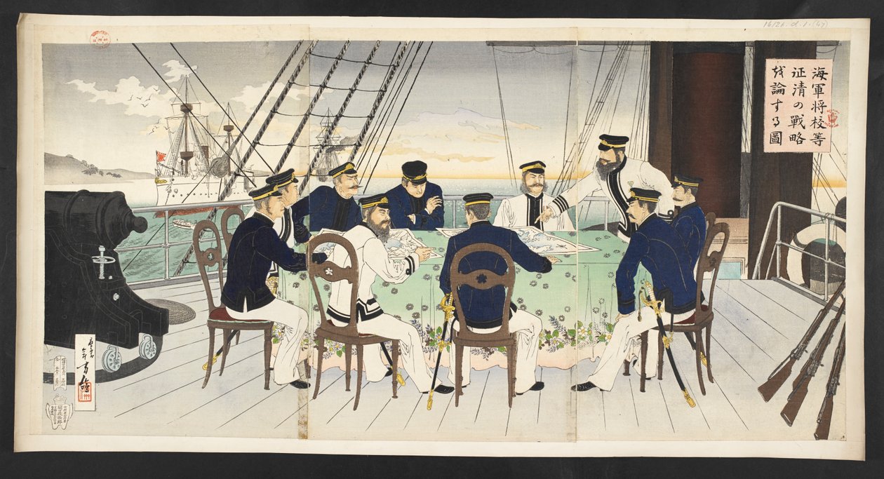 marine · marine · armee · truppen · streitkräfte · kleidung · kleidung · stoff · stuhl · schiff · schiffe · chinesisch-japanischer krieg · sprechen · bewaffnete konflikte · uniform · kriege · wasserfahrzeuge · marinerang · farben · stühle · farbe · deck · 19. jahrhundert · reden · möbel · holzschnitt · seetransport · seeberufe · tisch · holzschnitt · kleidung · gespräch · militärereignis · bewaffneter konflikt · kleidung · japanisch · kampf · rede · sprechen · krieg · militärereignisse · farbe · kleidung · transport · marineoffizier · gespräch · transport · British Library, London, UK / Bridgeman Images
