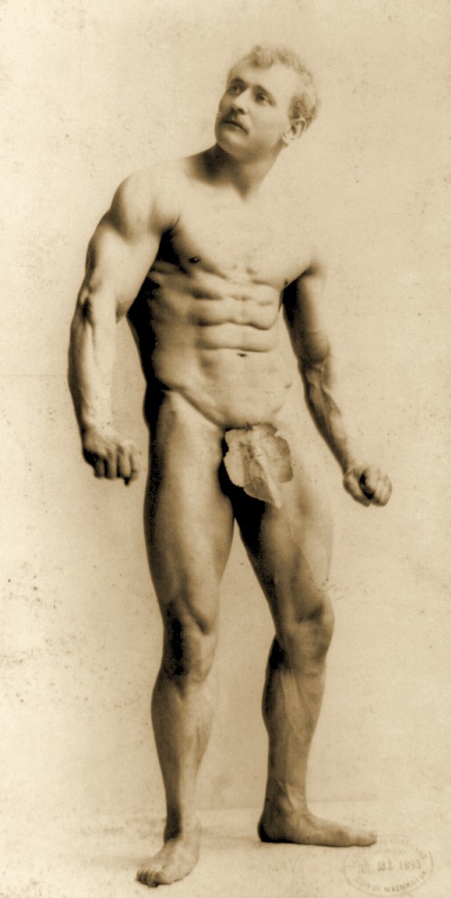 zirkus · sportler · darsteller · stern · bühne · bühnenname · leistung · stark · kraft · stark · zerrissen · aufgepumpt · körperlich · sportlich · starker mann · starker mann · perfektion · eugen sandow · bodybuilder · pionier · bahnbrechend · männlich · mann · männlich · schönheit · schön · körper · körperbau · konkurrent · wettbewerb · bauen · pose · posieren · model · schnurrbart · nackt · nackt · muskulös · muskulös · muskeln · straff · gesundheit · sport · fitness · deutsch · ziegfeld · modellieren · buskin · buskins · bodybuilding · bodybuilder · form · c19. · 19. jahrhundert · studium · porträt · foto · photographie · photographie · bild · ganzkörperansicht · feige · blatt · muskel · nacktheit · Akte · Private Collection / Bridgeman Images