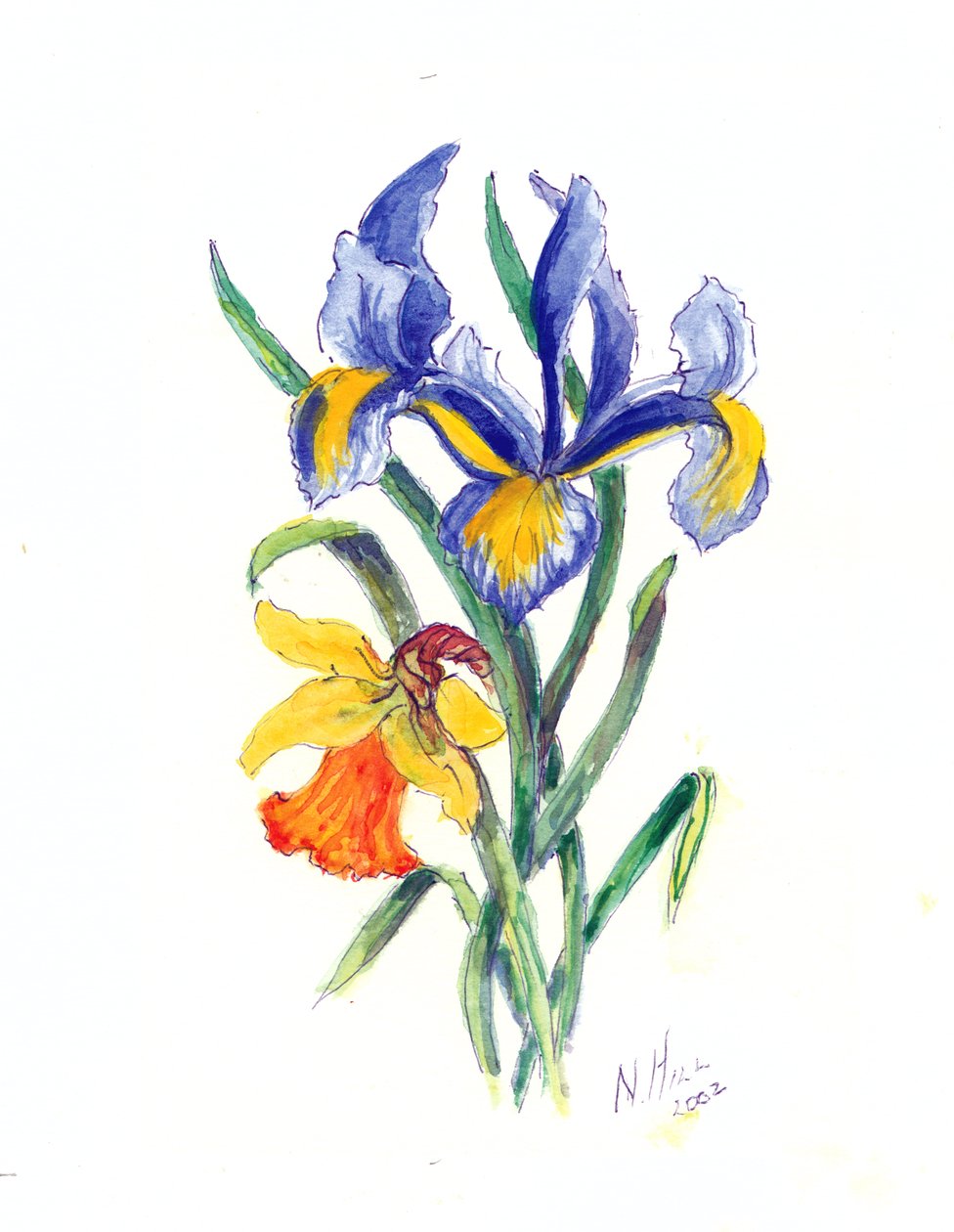 Blaue Iris und Narzisse, 2002(Blue Iris and Daffodil, 2002 (wc on paper))Nell Hill |