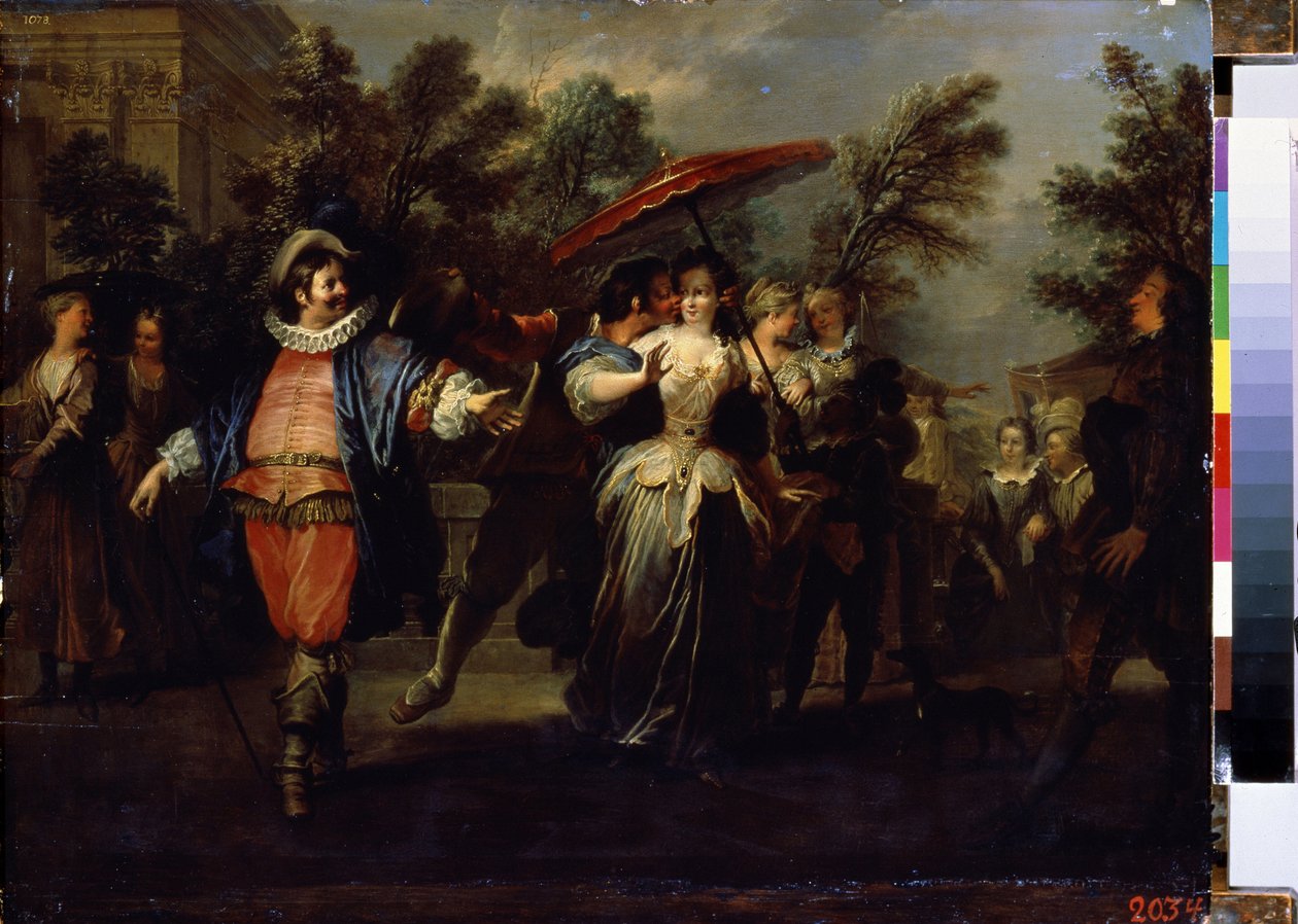 gürtel · schüchternheit · kunst · malerei · frankreich französisch · fabel · poesie · literatur · 17. 17. xvii xviith jahrhundert · mode · männermode · kostüm · gesellschaft · mann · frau · eleganz · sonnenschirm · romantik (liebe) · liebe · kuss · verführung · stiefel · schuh · liebeserklärung · la fontaine jean de (arbeit) · lafontaine jean de (arbeit) · ruff (kleidung) · Männlichkeit · State Hermitage Museum, St. Petersburg, Russia / Bridgeman Images |