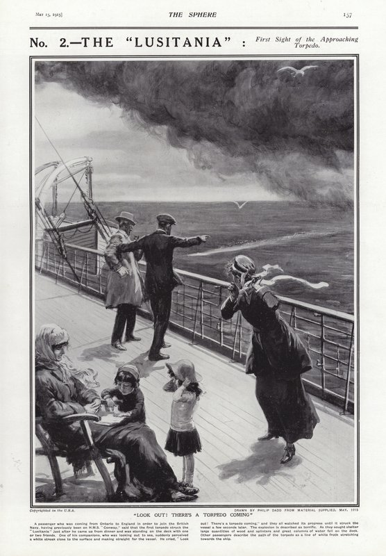 1. weltkrieg · erster weltkrieg · erster weltkrieg · seekrieg · u-boot · u boot · u 20 · lusitania · untergang · kreuzfahrtschiff · dampfer · propaganda · kriegsverbrechen · passagierschiff · britisch · 1910er jahre · cunard · torpedo · sichtung · aufwachen · deck · passagiere · Attacke · Private Collection / Bridgeman Images · / Look and Learn