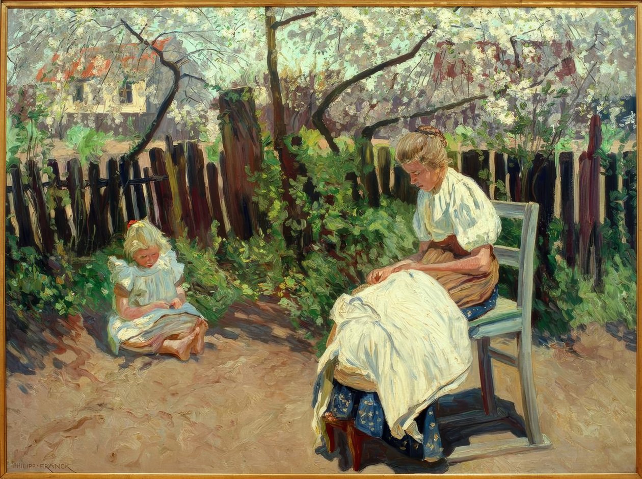 baumblüte · berliner · sezession · deutsche · kunst · dorf · dorfleben · frau · frauenleben · frühling · garten · garten · park · gartenzaun · handarbeit · hausfrau · freien · allgemein · impressionismus · jahreszeiten · jahrhundertwende · kind · kinderleben · kunst · landbevölkerung · landleben · landschaft · mädchen · menschen · garten · menschen · park · mutter · mutter · kind · mutter · tochter · nähen · obstbaum · sonnenlicht · sonnenschein · stuhl · geographie · deutschland · technik · gemälde · malerei · öl · auf · leinwand · Frankfurt A. M., Historisches Museum / akg-images |