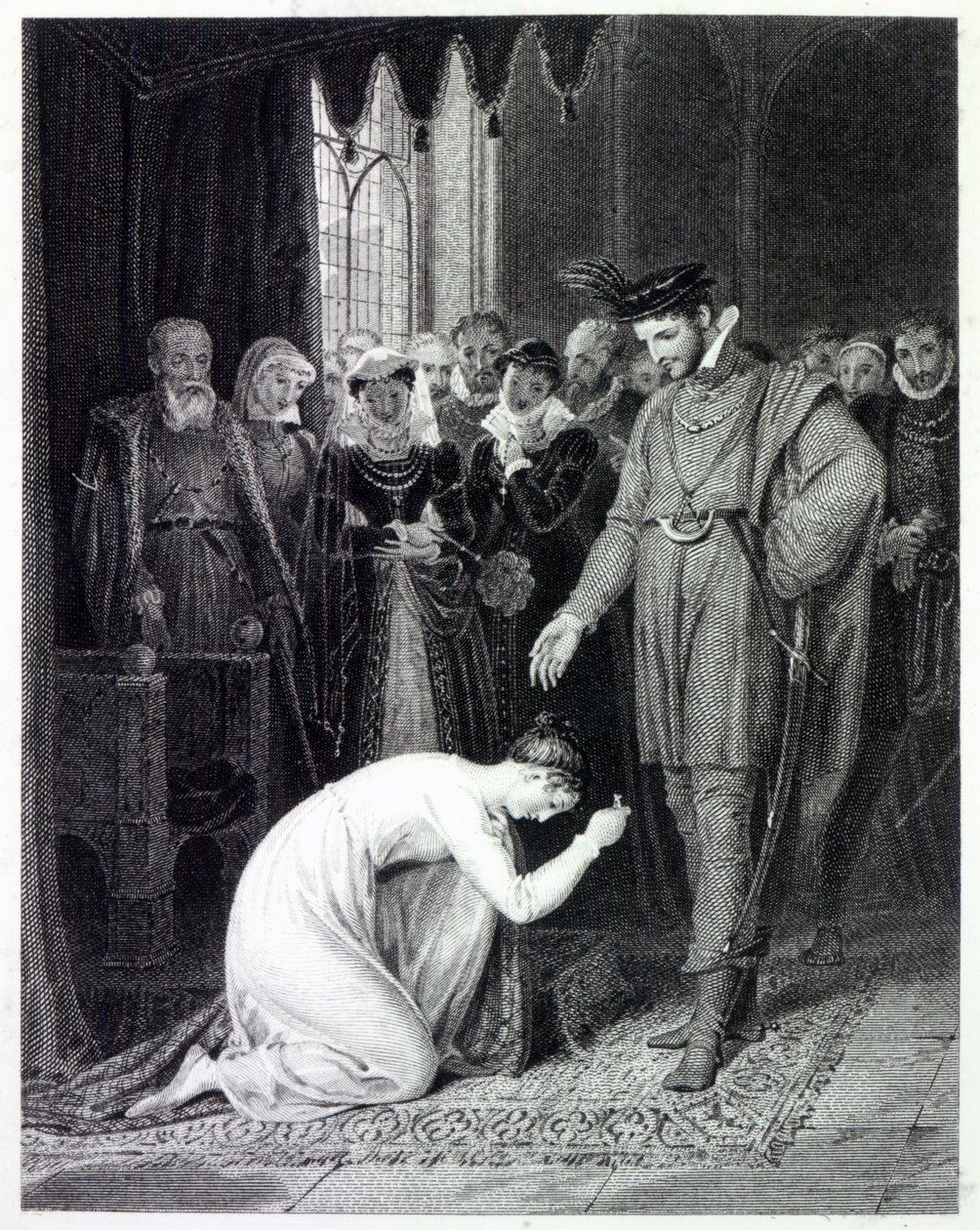 knien · erzählung · literatur · gedicht · legende · romantik · frau · mann · tochter · zuschauer · könig · publikum · ehering · verlobungsring · respekt · gericht · höflinge · Private Collection / Bridgeman Images |