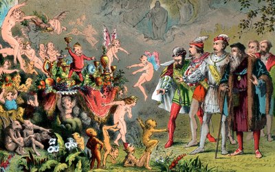 Alonso spricht in Der Sturm, Akt III, Szene III, 'Himmel, was waren diese', aus 'The Illustrated Library Shakespeare', veröffentlicht London 1890(Alonso speaks in The Tempest, Act III, Scene III, 'Heavens, what were these', from 'The Illustrated Library Shakespeare', published London 1890 (colour litho))Robert Dudley |