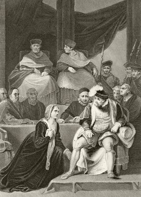 könig · königlicher hof · thron · bitte · fall · unschuld · höfling · höflinge · betteln · anklage · scheidung · flehen · knien · priester · thomas cranmer · königin · katherine · 16. jahrhundert · mann · frau · tudor · katharina · gerichtsverfahren · herrscher geistliche · könige · herrscher · königliche · britische · britische · britische · britische · englische · englische · Private Collection / Bridgeman Images