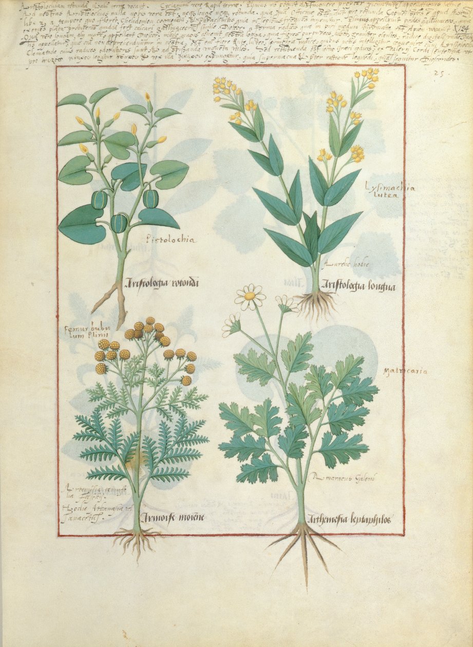 Obere Reihe: Aristolochia Rotundi und Aristolochia Longua. Untere Reihe: Armoise und Artemesia, Illustration aus dem 'Simple Book of Medicines' von Matteaus Platearius 124r(Top row: Aristolochia Rotundi and Aristolochia Longua. Bottom row: Armoise and Artemesia, illustration from The Simple Book of Medicines, by Matteaus Platearius 124r)Robinet Testard |