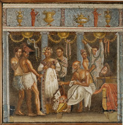 Römische Kunst: Frühling Flora pflückt Blumen. Fresko aus der Villa von Varano in Stabiae (Stabiae), in der Nähe von Pompeji. 15 v. Chr.-60 n. Chr. Museo Archeologico Nazionale, Neapel - Römische Kunst: Frühling, Flora pflückt Blumen. Fresko aus der Villa Das Alexander-Mosaik, Darstellung der Schlacht bei Issus zwischen Alexander dem Großen und Darius III im Jahr 333 v. Chr., römisches Bodenmosaik aus dem Haus des Fauns Trompe-l’oeil-Garten aus der Villa von Livia, 40-20 v. Chr. Frühling, Mädchen sammelt Blumen, aus der Villa von Varano in Stabiae, ca. 15 v. Chr.-60 n. Chr. Porträt von Sappho, griechische Dichterin. Römische Frau mit Buch und Stift (Stylus oder Stilus), aus Pompeji, Neapel, Italien Römische Kunst: Memento mori, Symbole des Lebens und des Todes (Mosaik aus Pompeji, 2. Stil) Tafel aus dem Cubiculum aus dem Schlafzimmer der Villa von P. Fannius in Boscoreale, Pompeji, ca. 50-40 v. Chr. Platon im Gespräch mit seinen Schülern, aus dem Haus von T. Siminius, Pompeji (Mosaik) Medea - Römisches Fresko aus Stabia, Italien Silenus und der junge Satyr, Ostwand, Oecus 5, 60-50 v. Chr. Blasphemisches Graffito einer Kreuzigung Aeneas, verwundet mit seinem Sohn Iulus, wird vom griechischen Arzt Iapige, Sohn von Iaso, behandelt. Römisches Fresko aus dem 1. Jahrhundert n. Chr. aus Pompeji. Neapel, Nationales Archäologisches Museum - Römische Kunst: Verwundeter Aeneas wird von Iapig Darstellung der griechischen Gottheit Priapus, Gott der Fruchtbarkeit, mit riesigem ständig erigiertem Penis. Detail eines Freskos aus Pompeji. Casa dei Vettii. 1. Jahrhundert n. Chr. Fresko, das Venus darstellt, Haus der Venus in der Muschel, Pompeji (Unesco-Welterbeliste) Junge Frauen im Bikini, Villa Romana del Casale, Sizilien, 315-350 n. Chr. (Mosaik)