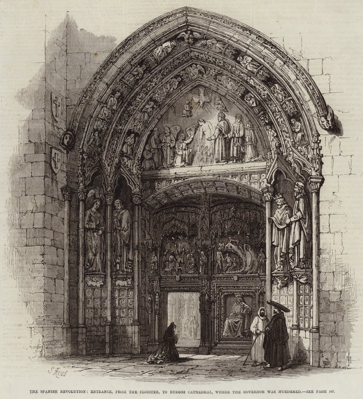 spanische revolution · eingang · kloster · kathedrale von burgos · gouverneur · ermordet · glorreiche revolution · andachtsorte · spanien · die architektur · Private Collection / Bridgeman Images · / Look and Learn |