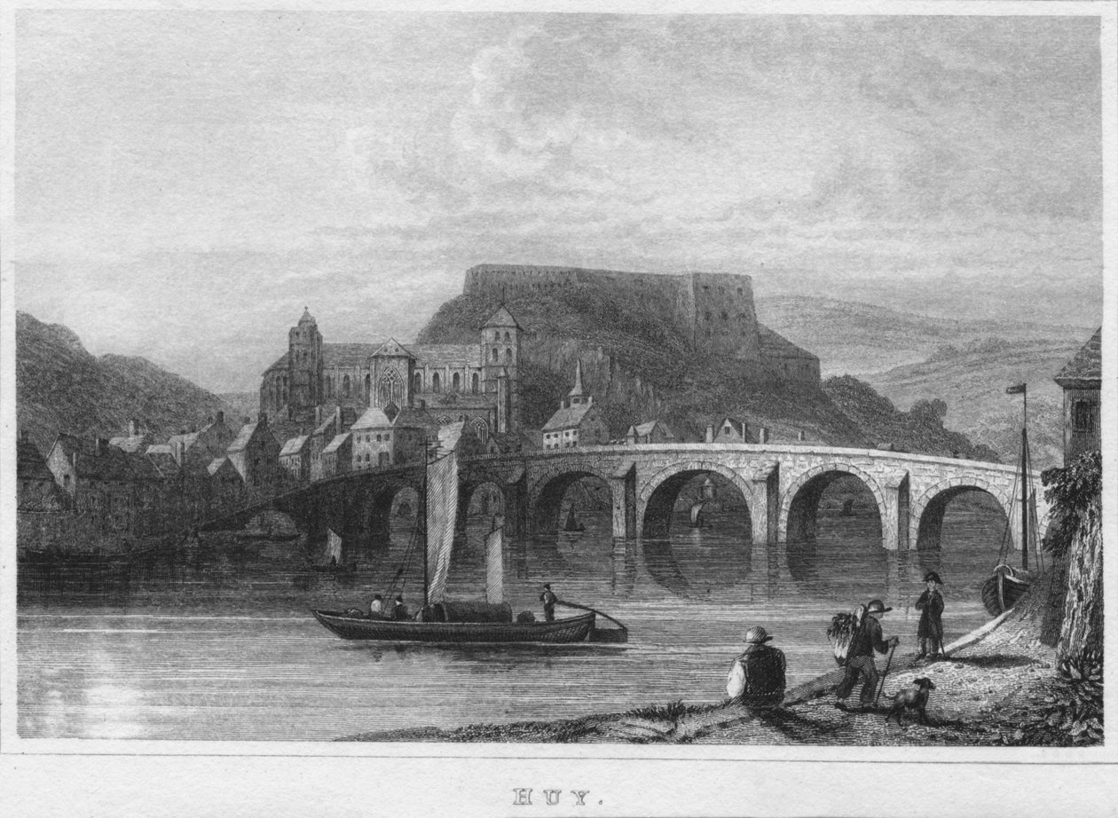 transport · transport · draußen · fluß · leute · mann · mann · männer · boot · boote · land · kerl · brücke · ansicht · geographie · belgien · belgier · position · jahrhundert · vista · riverbank · errichtendes äußeres · einfarbig · graviert · publikation · gewölbt · 19. jahrhundert · wassertransport · schwarzes u. weiß · schwarzes und weiß · hintergrundleute · lüttich · 19.jahrhundert · engraving · landscape · shury son · walloon · continental tourist · parry and co · parry and · hoyoux · huy · The Print Collector/Heritage Images |