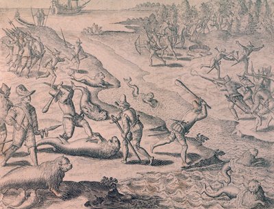 Expedition von Thomas Cavendish aus 'Americae' von Theodor de Bry, um 1593 (Gravur)(Expedition of Thomas Cavendish from 'Americae' by Theodor de Bry, c.1593 (engraving))Theodor de Bry |