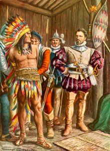 flagge · landung · flagge · entdeckung · entdeckung · indianer · amerika · kniend · treffen · erkundung · gruß · kopfschmuck · männlich · Private Collection / Bridgeman Images |