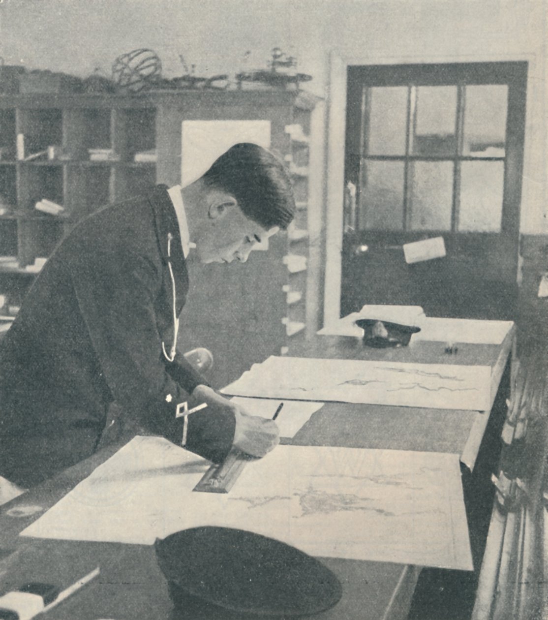 england · leute · mann · innen · zuhause · mann · männer · planung · künste · diagramm · industrie · schreibtisch · kunst · buch · kerl · devon · jahrhundert · zeichnung · nach innen · maß · richtlinie · dreißiger jahre · cartography · möbel · literatur · lehre · navigation · plotten · eine person · einfarbig · dartmouth · veröffentlichen · verschiffen industrie · schwarzes u. weiß · schwarzes und weiß · dreißiger jahre · 20. jahrhundert · map room · portrait · unknown · winchester · clarence · publishing house · amalgamated press · clarence winchester · shipping wonders of the world · The Print Collector/Heritage Images |