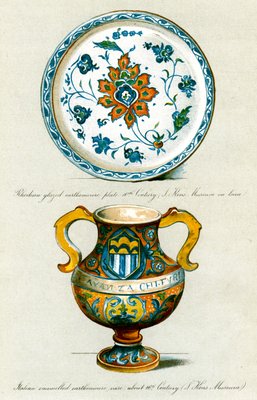 farbe · farbe · platte · keramisch · teller · keramik · jahrhundert · mit blumen · tonwaren · vase · töpferware · 16. jahrhundert · sechzehntes jahrhundert · majolica · engraving · unknown · The Print Collector/Heritage Images
