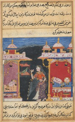 Seite aus Geschichten eines Papageis Tuti-nama: Siebte Nacht: Der Papagei spricht Khujasta an..., ca. 1560(Page from Tales of a Parrot Tuti-nama: Seventh night: The parrot addresses Khujasta..., c. 1560. )Unbekannt |