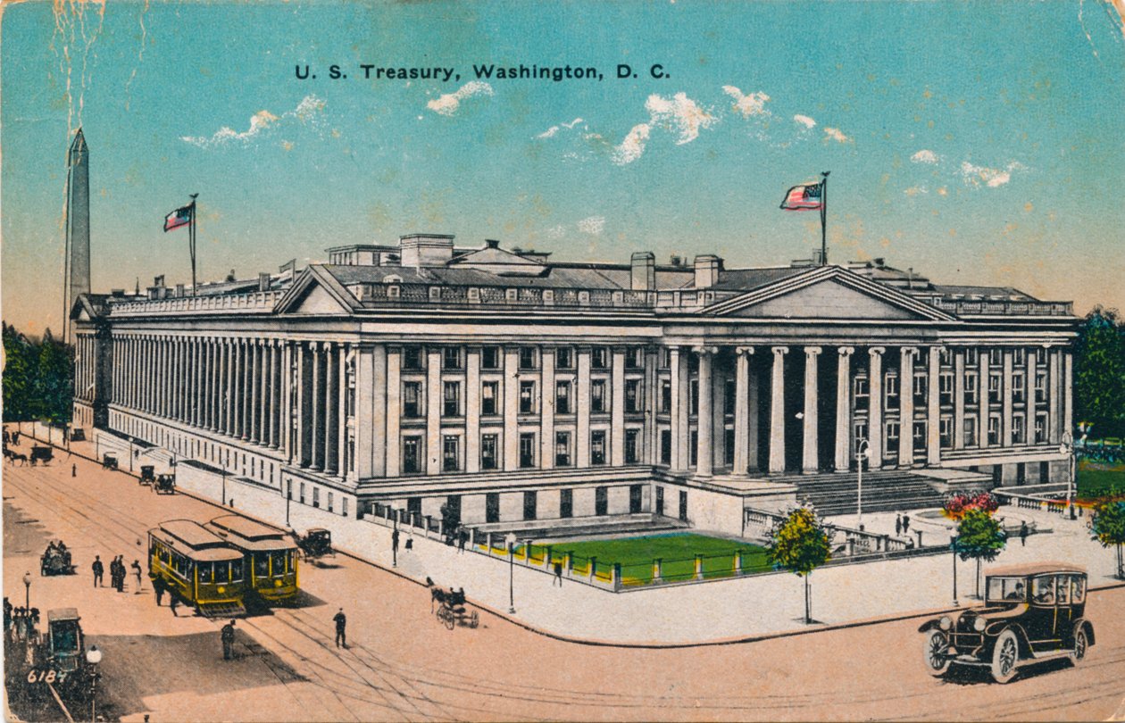 transport · transport · außen · stadt · gebäude · gebäude · auto · autos · automobil · architektur · markierungsfahne · markierungsfahnen · land · farbe · farbe · washington · förderwagen · washington dc · position · jahrhundert · fahne · fassade · draußen · fiskus · zwanziger jahre · errichtendes äußeres · standard · streetcar · straße transport · vereinigte staaten von ameri · vereinigtes s · automobil · zwanziger jahre · nationaler historischer grenzstein · 20. jahrhundert · façade · fiskus-gebäude · amerikanisch · amerika · postcard · unknown · co · bs reynolds co · bs reynolds · The Print Collector/Heritage Images |