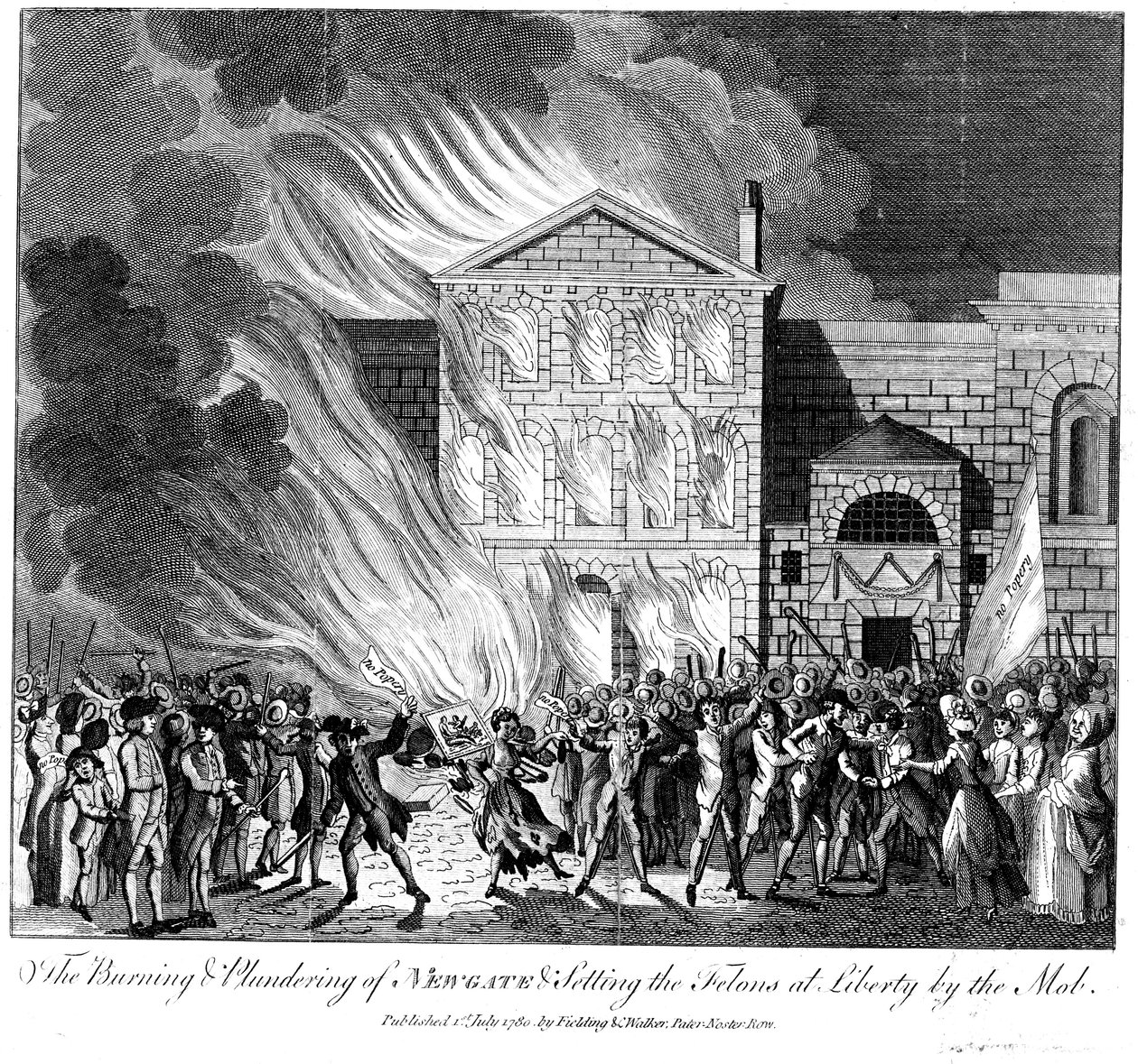 gebäude · gebäude · england · leute · masse · zerstörung · fromm · religion · gesetz · verbrechen · brennen · feuer · konfrontation · christentum · gefängnis · jahrhundert · stadt von london · aufstand · gefangener · anarchie · konzept · brandstiftung · störung · aufstand · pöbel · einfarbig · protestantism · penitentiary · schwarzes u. weiß · schwarzes und weiß · 18. jahrhundert · achtzehntes jahrhundert · randalieren · ann ronan pictures · engraving · unknown · lord george gordon · gordon · lord george · Ann Ronan Picture Library/Heritage-Images