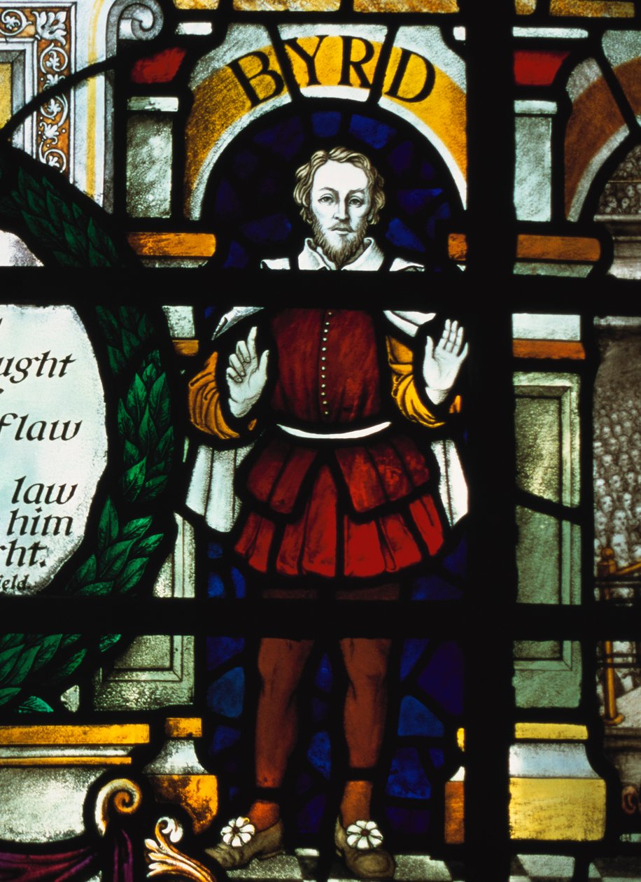 (William Byrd (1543-1623)- image of the English composer in a stained glass window, St Sepulchre Church, London)