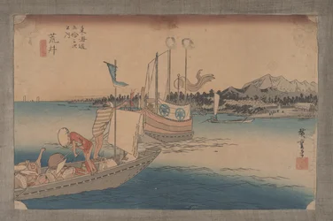 ukiyo-e · stationen des tokaido · japan · japanisch · ostasien · ostasiate · landschaft · landschaften · nr. 32 · küste · küsten · küsten · boot · boote · schiff · schiffe · araj · fähre · fähren · Free Library of Philadelphia / Bridgeman Images