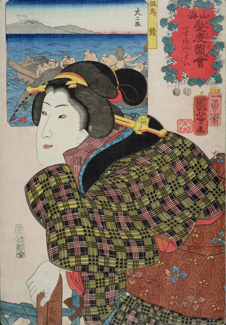 Menschen werfen ein Netz aus und eine Frau denkt an ihren Liebhaber, 1852(People casting a net and a woman thinking of her lover, 1852 (colour woodblock print))Utagawa Kuniyoshi |