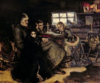 vater · tochter · junges mädchen · mann · frau · kabine · interieur · gruppe · porträt · sitzend · sitzend · tisch · lesen · buch · fenster · kerzenhalter · Tretyakov Gallery, Moscow, Russia / Bridgeman Images