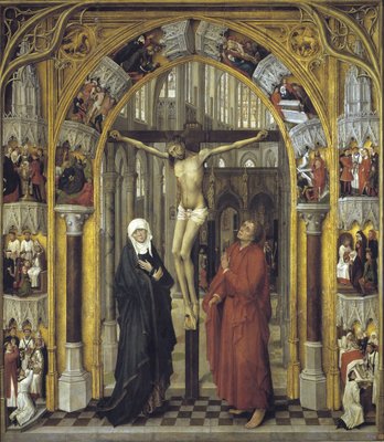 (Christ on the Cross, with the Virgin Mary and Saint John under an archway with Gothic tracery leading to a church, central panel from the Redemption Triptych, c.1460 )