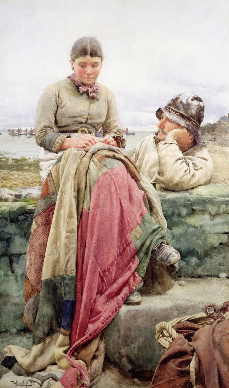 männlich · weiblich · liebhaber · jung · sitzend · mauer · bucht · meer · dorf · cornish · newlyn school · ausbessern · nähen · nähen · patchwork-quilt · strand · fischer · werben · umwerbung · unterhaltung · liebe · paar · beziehung · melancholie · Private Collection / Bridgeman Images