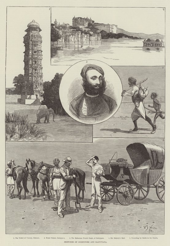 skizzen · oodeypore · rajputana · turm des sieges · chittore · wasserpalast · maharana fratch singh · die post ihrer majestät · reisen · dawk · wüste · indien · udaipur · die architektur · pferd · gezeichnet · transport · Private Collection / Bridgeman Images · / Look and Learn |