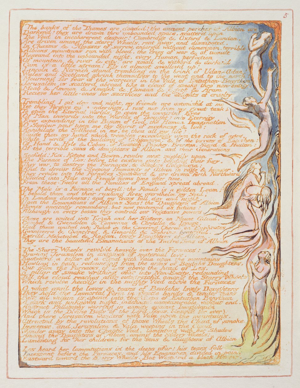 Die Ufer der Themse..., Platte 5 aus 'Jerusalem', 1804-20('The banks of the Thames...', plate 5 from 'Jerusalem', 1804-20 (relief etching printed in orange with pen und wc))William Blake |