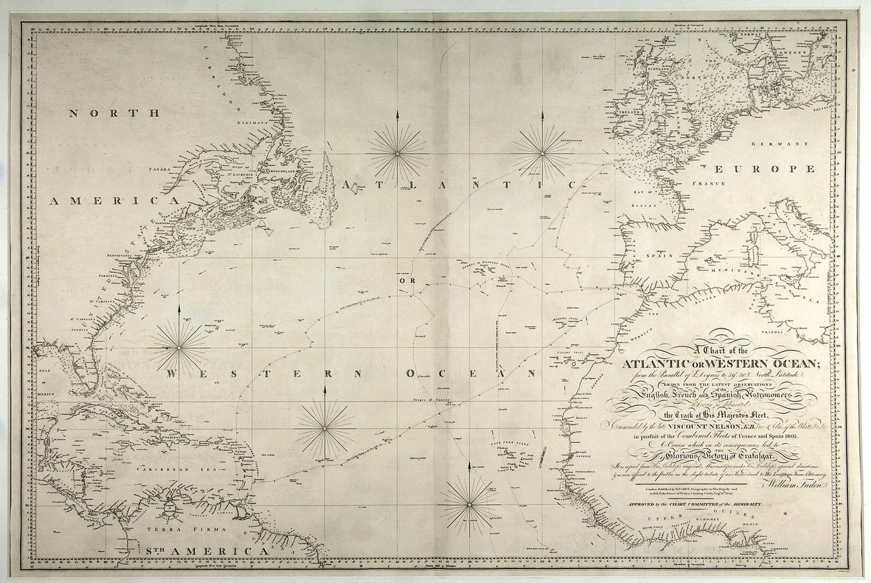 Eine Karte des Atlantischen oder Westlichen Ozeans, die die Route von Nelsons Flotte zeigt, 12. Mai-15. August 1805, 1807(A Chart of the Atlantic or Western Ocean, showing the track of Nelsons fleet, 12th May-15th August 1805, 1807 )William Faden |