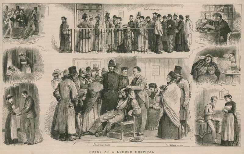 anmerkungen · london · krankenhaus · grafik · 27. dezember 1879 · menge · kleidung · mode · medizinisch · studenten · krankenschwester · arzt · polizist · chai · medizin · Private Collection / Bridgeman Images · / Look and Learn